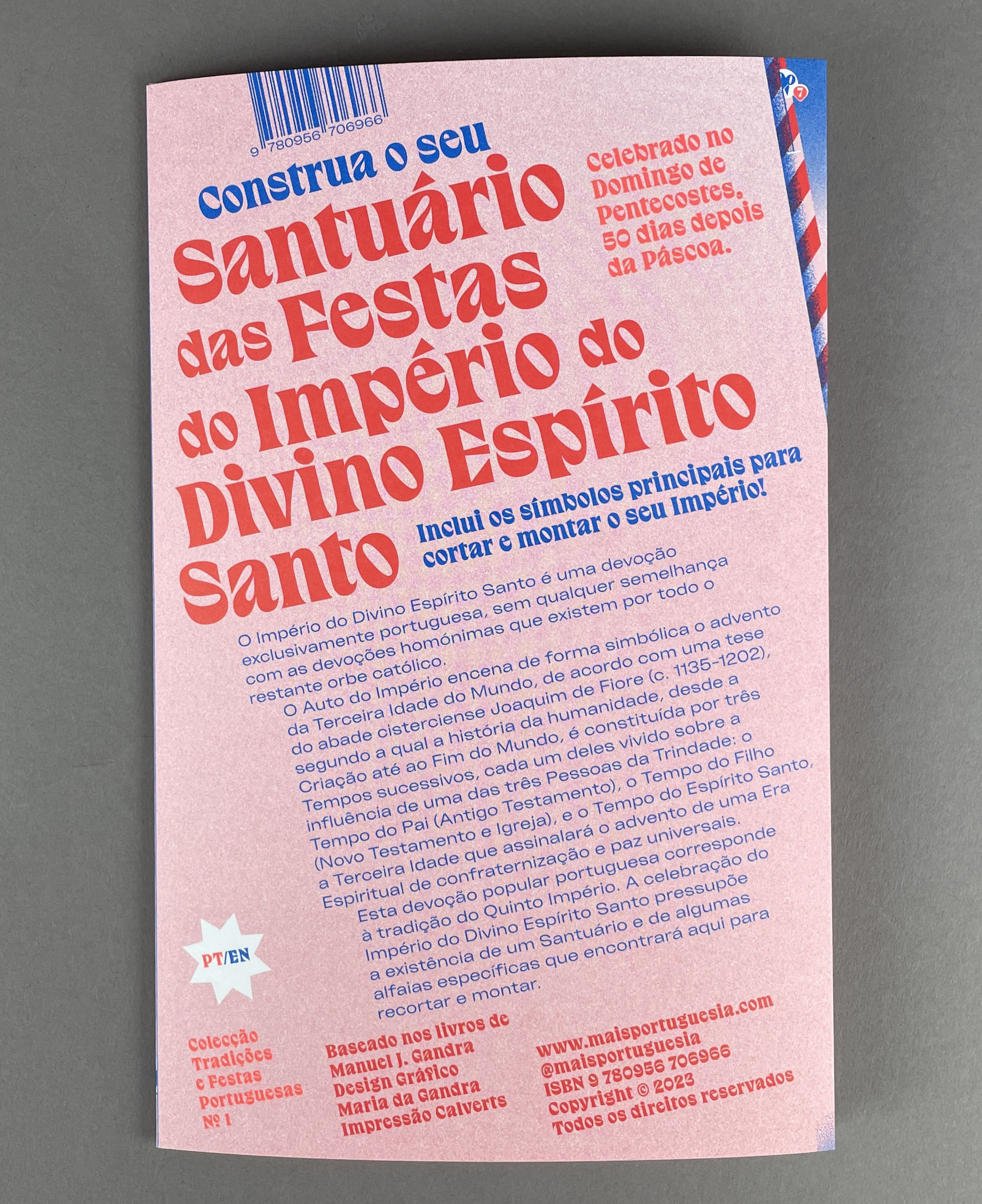 ︎︎︎The Empire of the Holy Spirit is an exclusively Portuguese devotion, that symbolically stages the coming of the Third Age of the World, a Spiritual Era of universal peace and harmony. The Feast of the Empire of the Divine Holy Spirit (which corresponds to the tradition of the Fifth Empire), presupposes the existence of a Sanctuary and some specific objects that you will find in this publication for you to cut and then assemble.